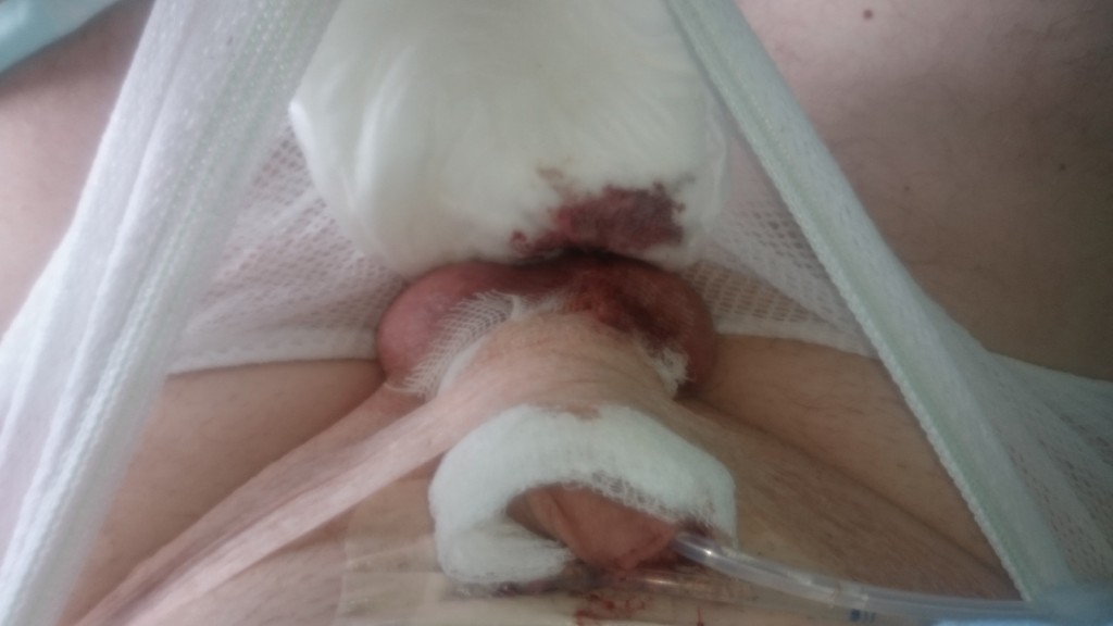 Previous ImageNext Image Day after operation: Penis Penis the day after surgery, showing bleeding and bruising.